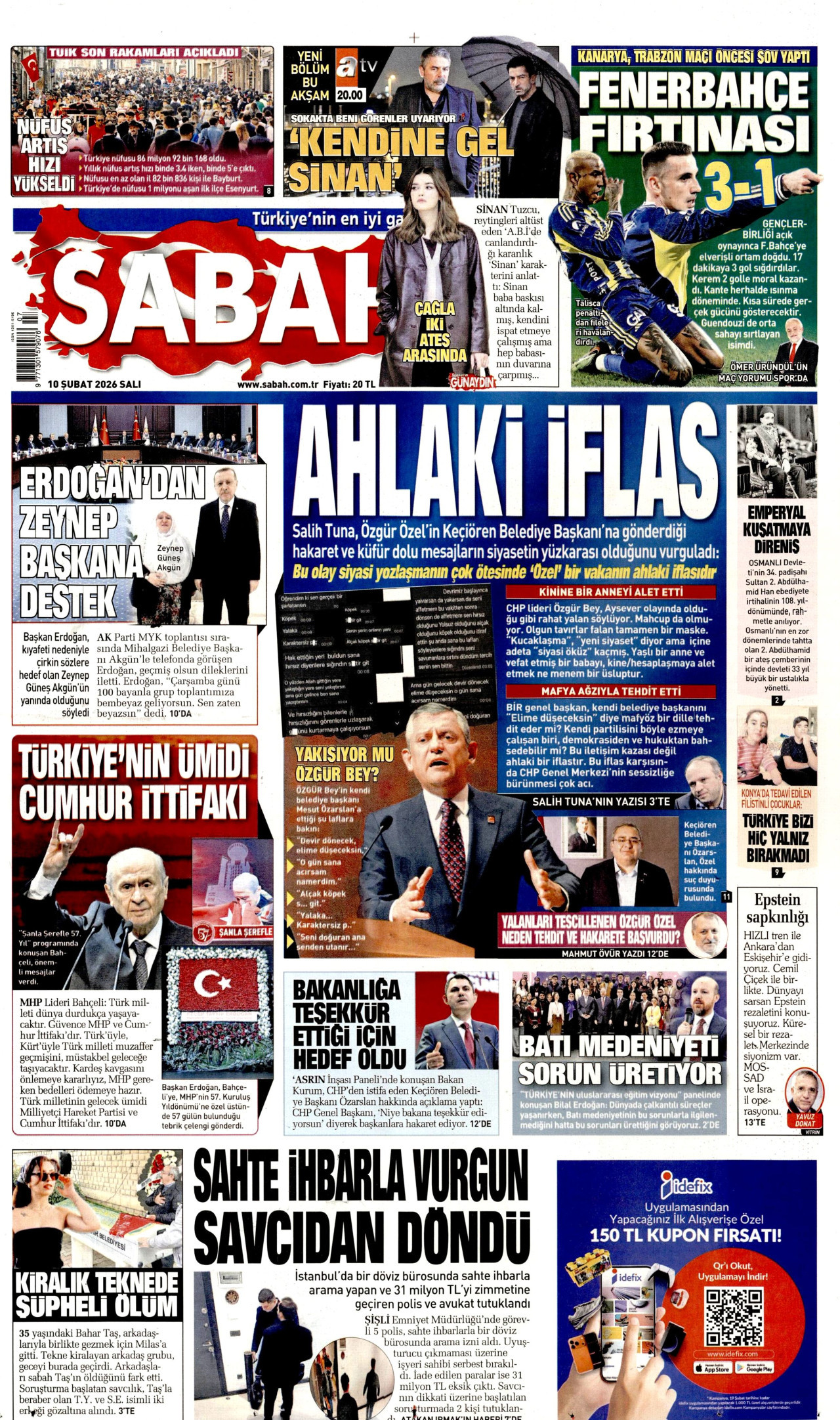 SABAH Gazetesi 10 Şubat 2026, Salı Günü Manşeti